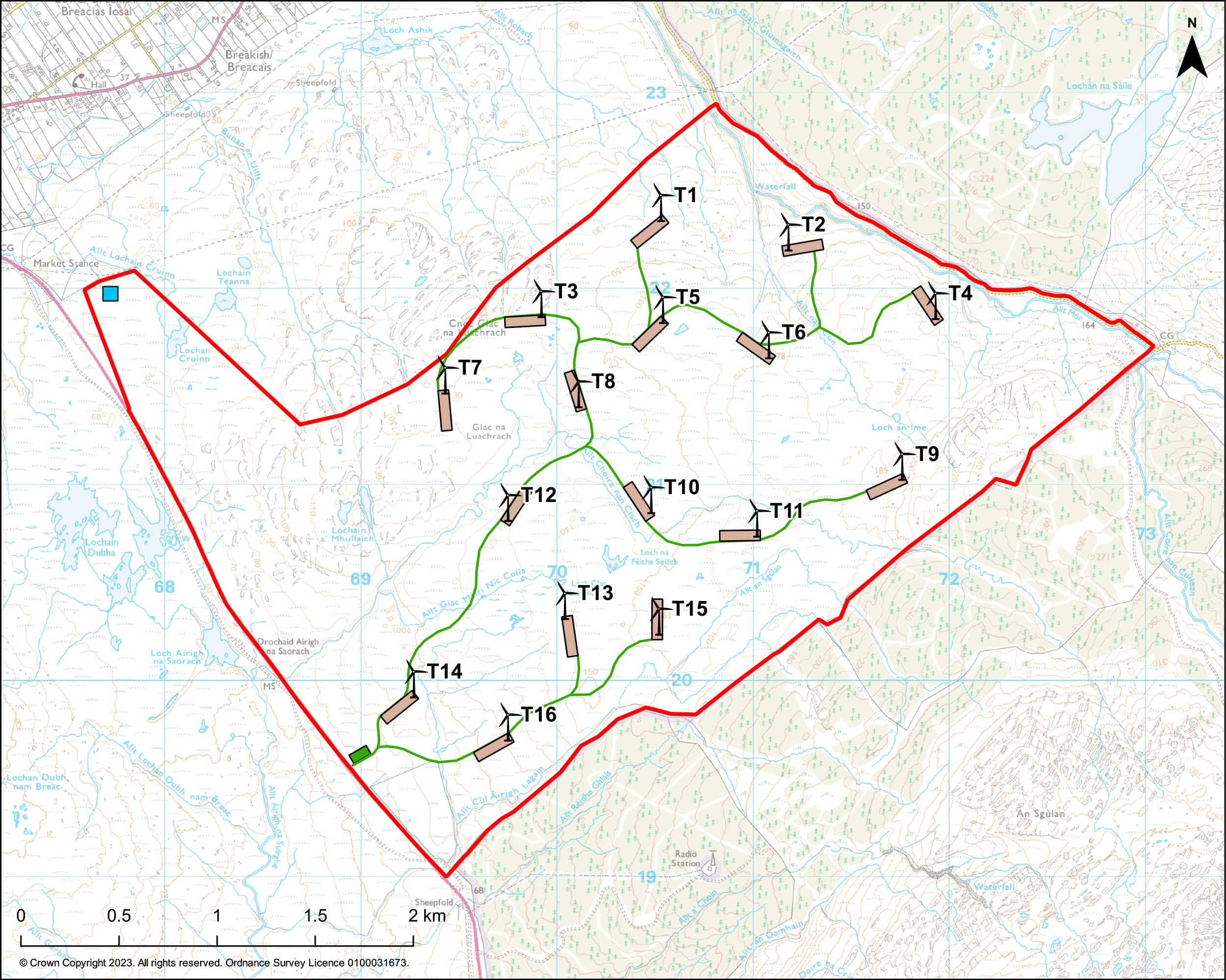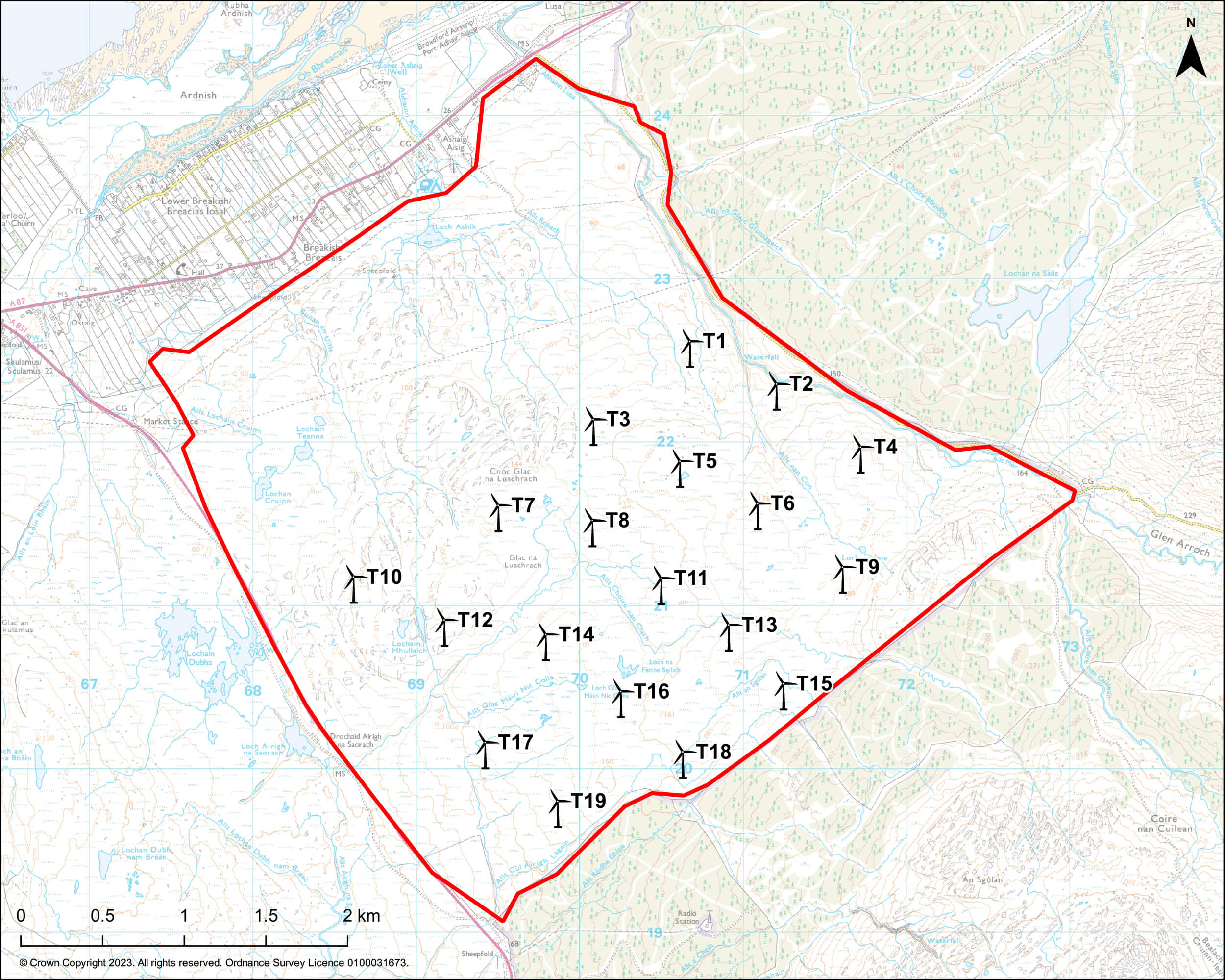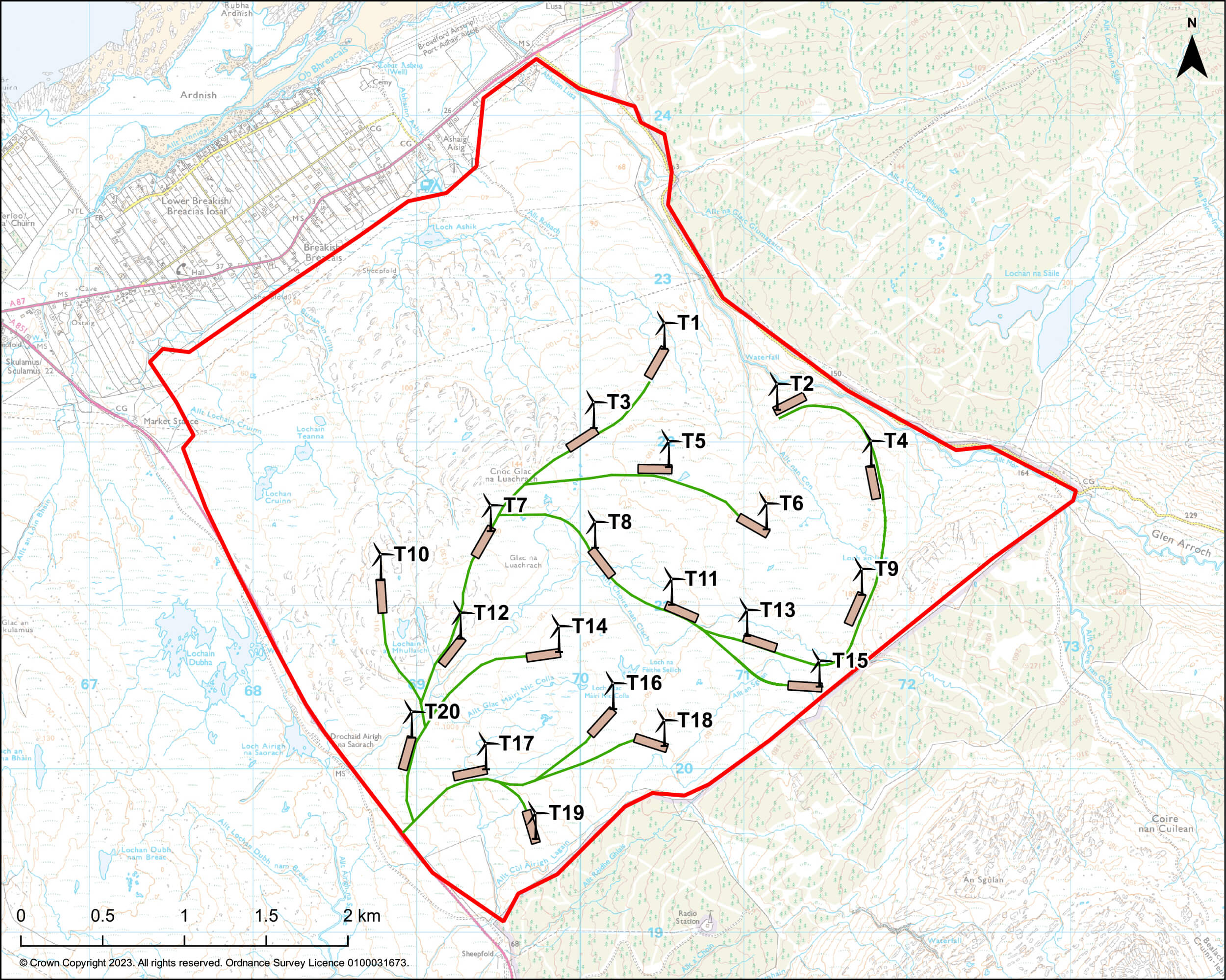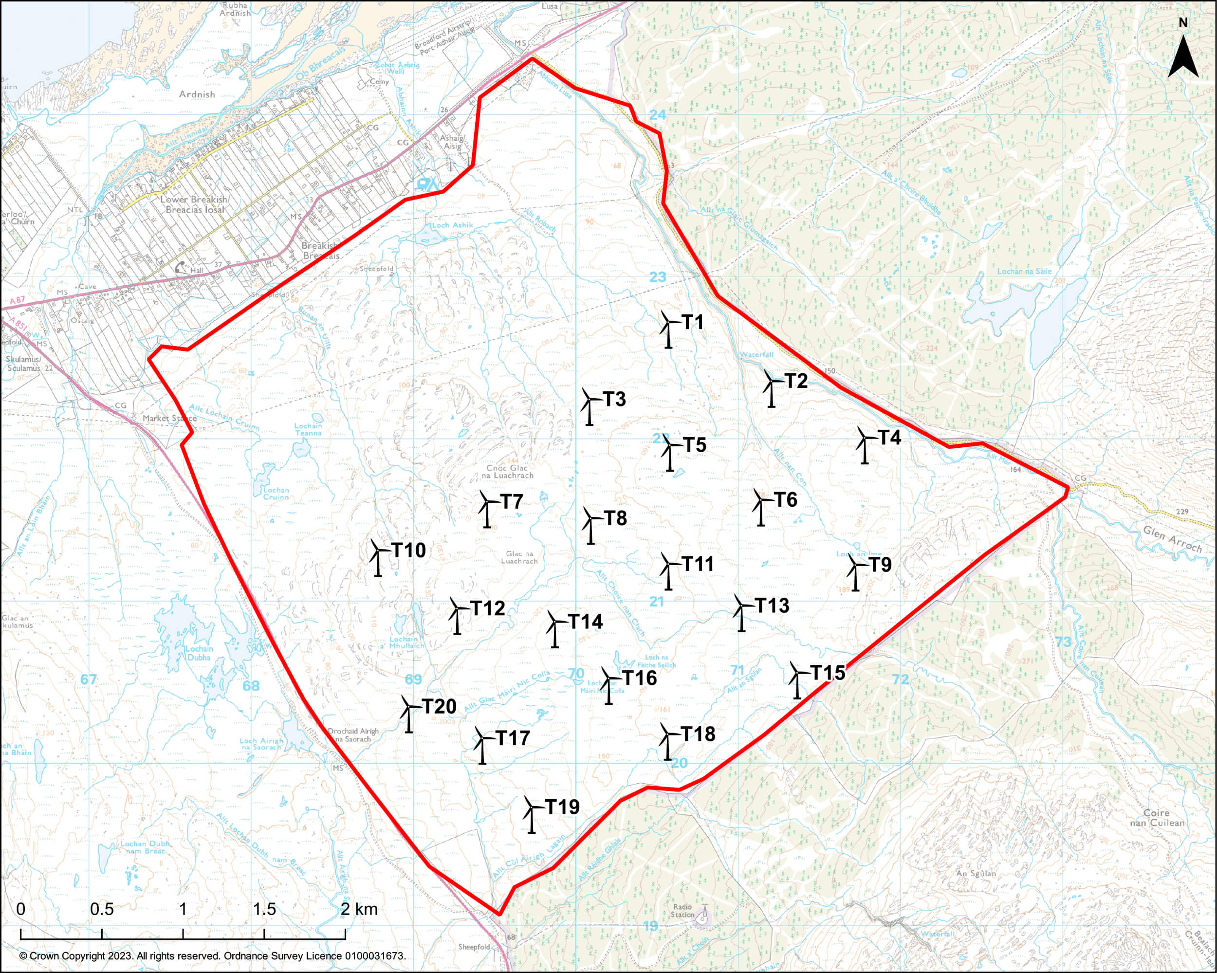 The proposed Development site forms part of the Fearann Eilean Iarmain estate on common grazing crofted by Breacais Ard and Breacais Local. The site is located on the Isle of Skye, approximately 6 km west of the Skye Bridge, and close to the A87, to the south of the Breakish settlement. The site lies between the A861 and the Glen Arroch Road and is bounded to the south by a forest edge and to the north by a line of pylons that crosses the moorland approximately 1 km south of the A87.